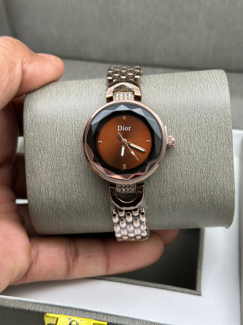 Pairing a faceted circular bezel in a warm rose‑gold tone with a sleek compact case that flatters slimmer wrists.