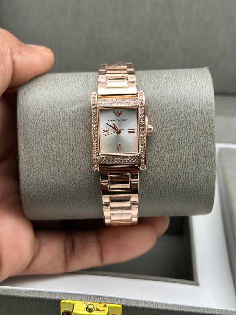 This Emporio Armani rose gold rectangular women’s watch is crafted to look and feel like fine jewellery
