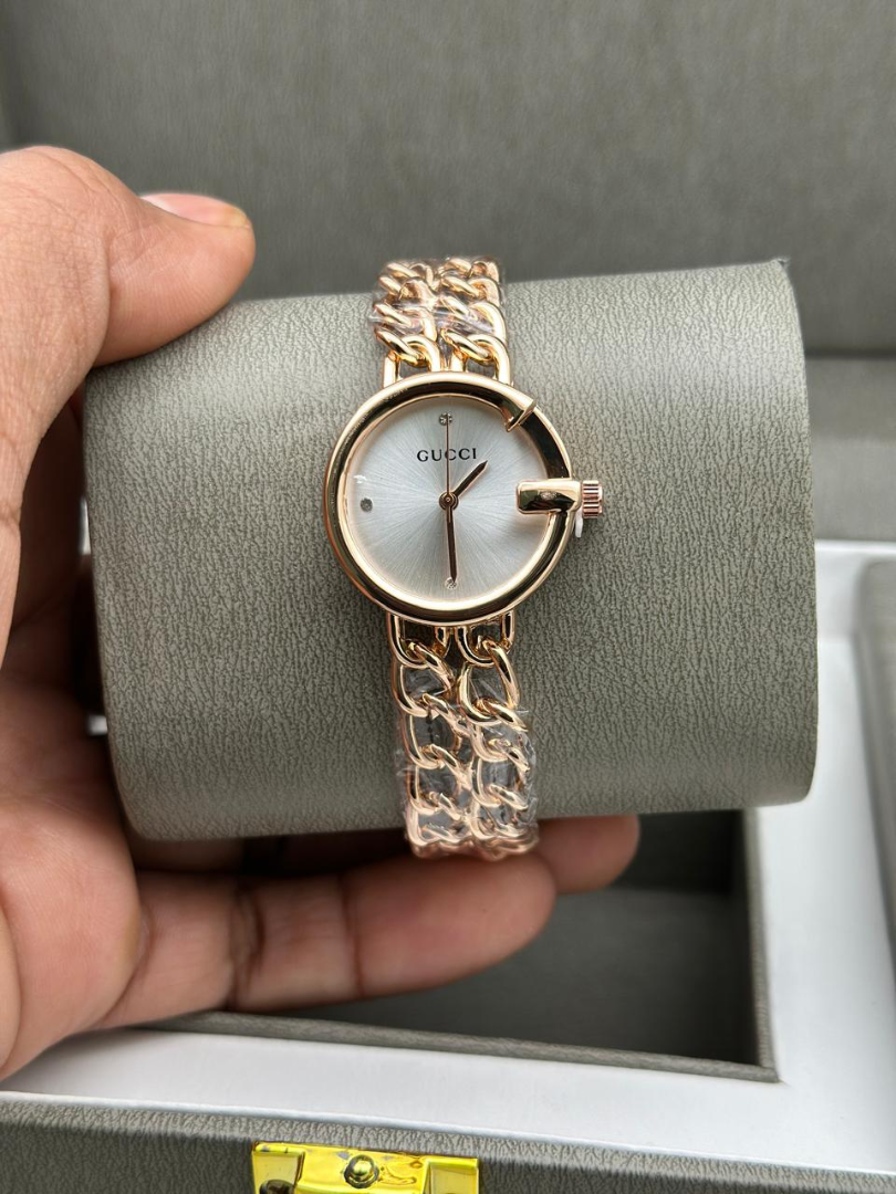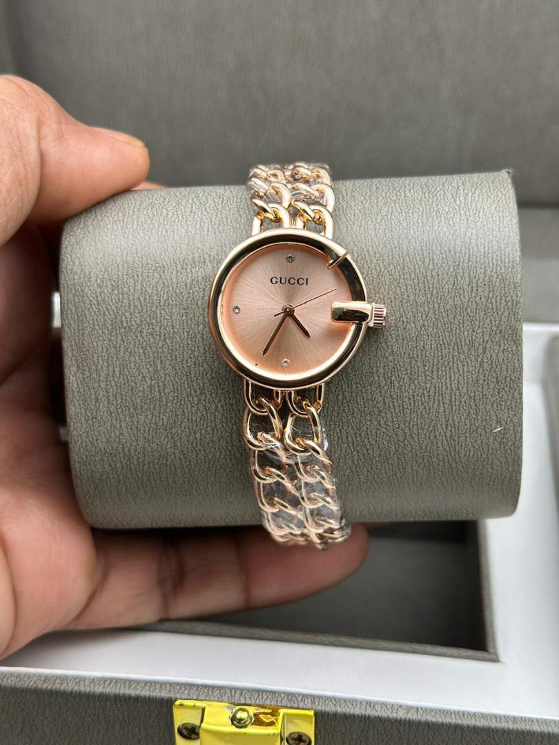 The clean dial in black, rose or silver is accented only by the Gucci logo, three slim hands and subtle crystal markers, ensuring the focus stays on refined details rather than cluttered complications.