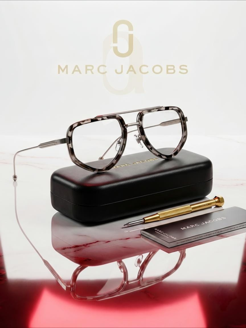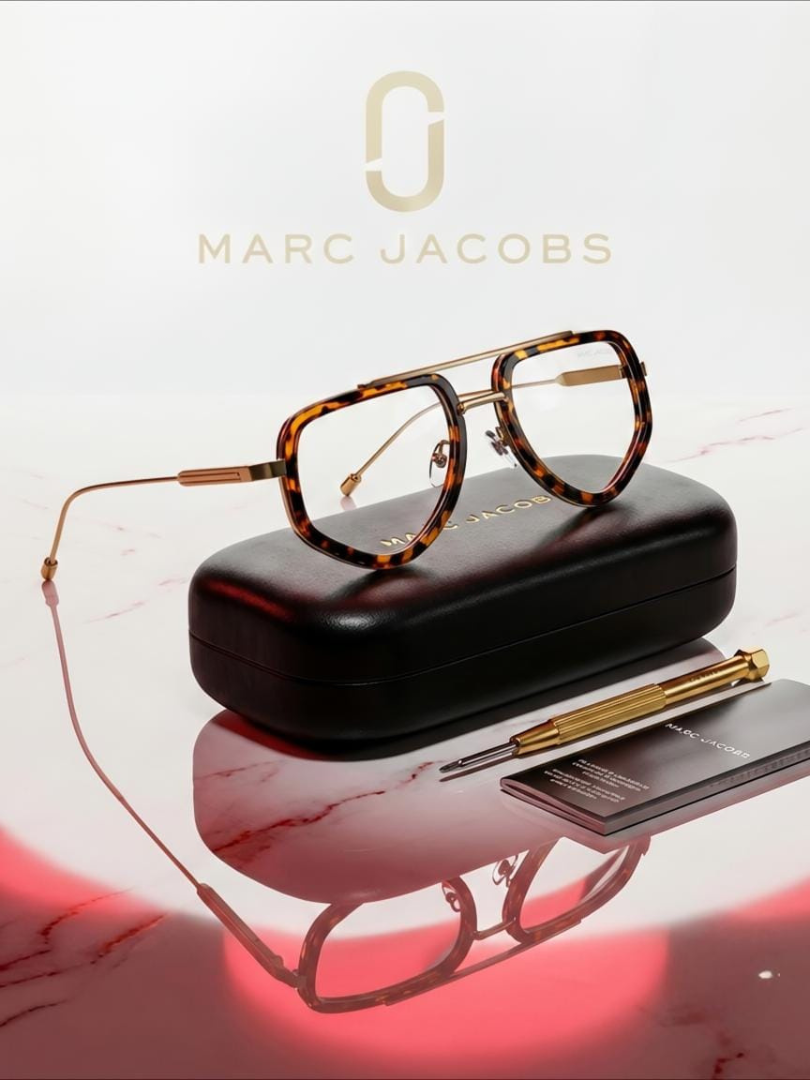 These Marc Jacobs aviator eyeglasses reinterpret a classic pilot shape through a bold, architectural lens.