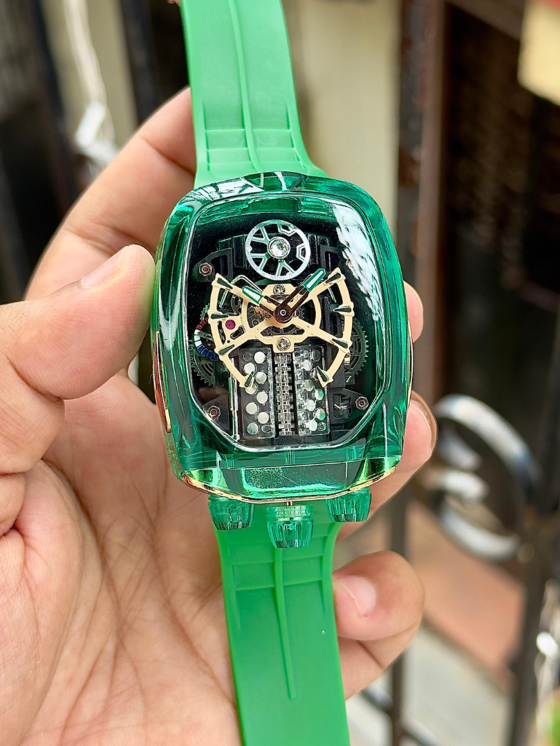 Crafted from solid sapphire blocks, each case in this collection is available in mesmerizing clear, vivid green, or bold yellow, achieved through precision engineering using metal oxides during the sapphire’s growth phase.