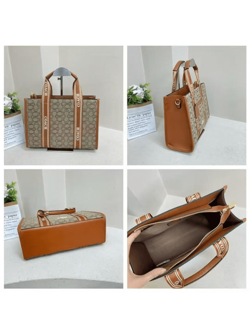 Available in elegant tan and bold black, this designer-inspired tote features the iconic Coach monogram pattern and contrasting branded straps, easily blending classic and contemporary style.