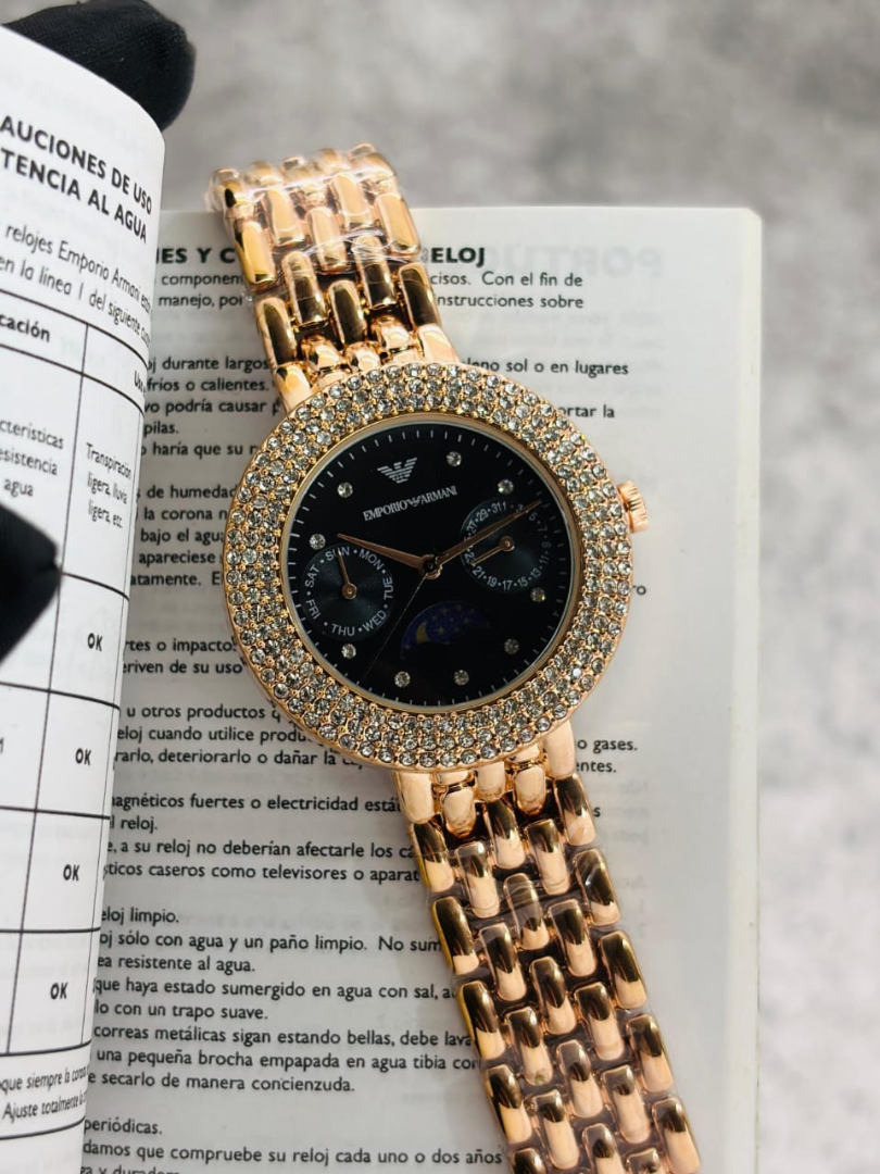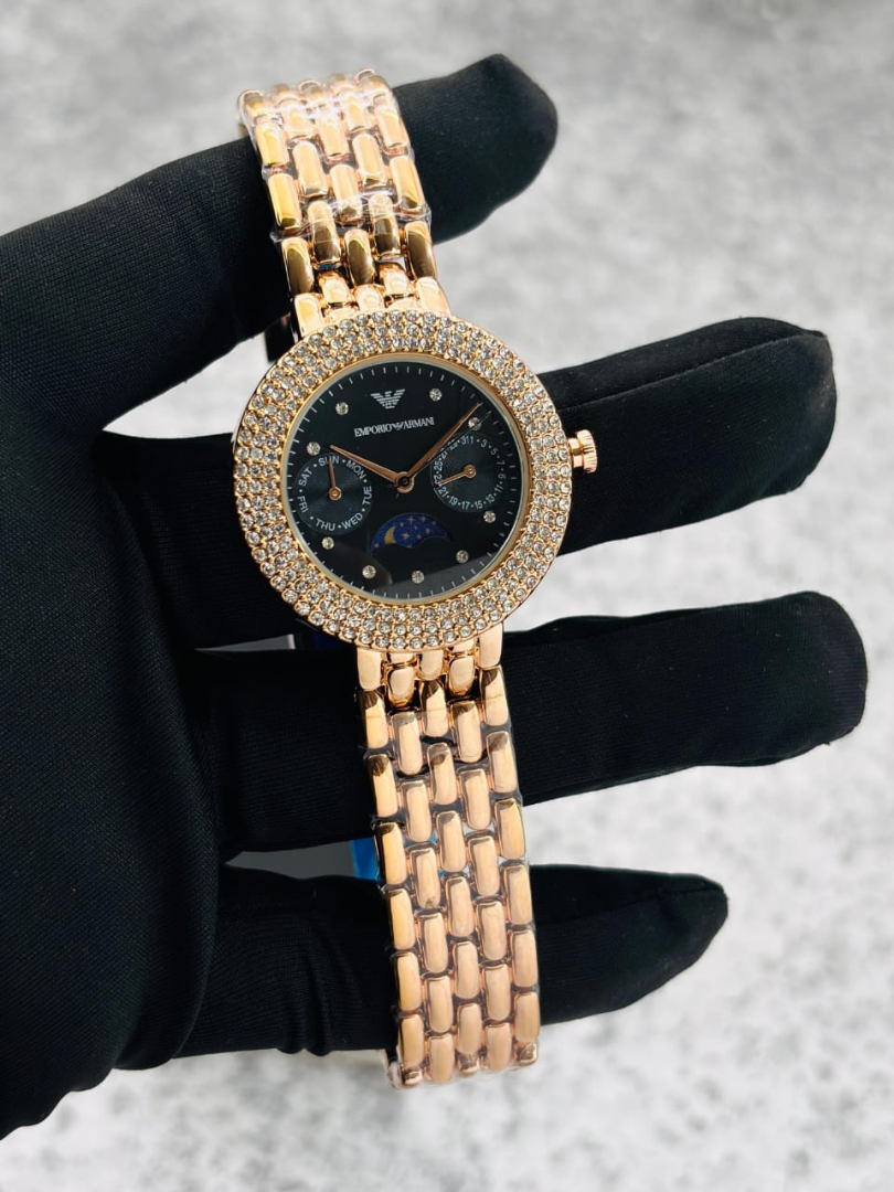 The Emporio Armani rose gold crystal watch is crafted for women who appreciate bold glamour with refined Italian finesse.