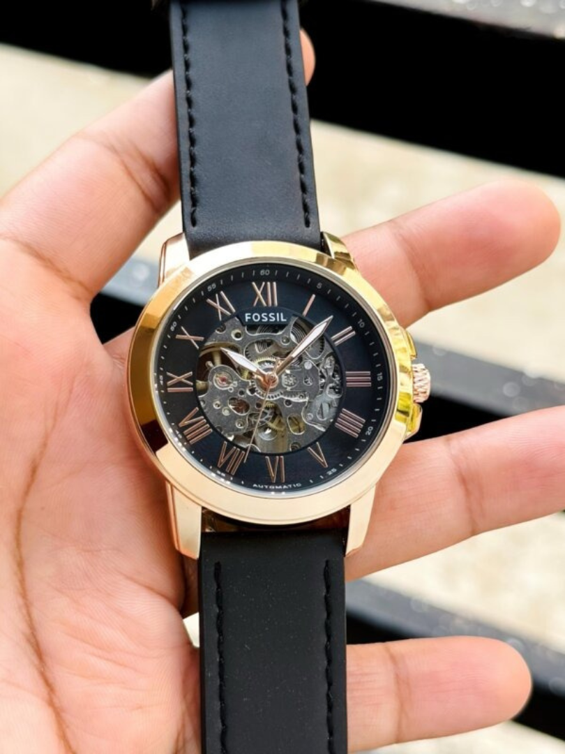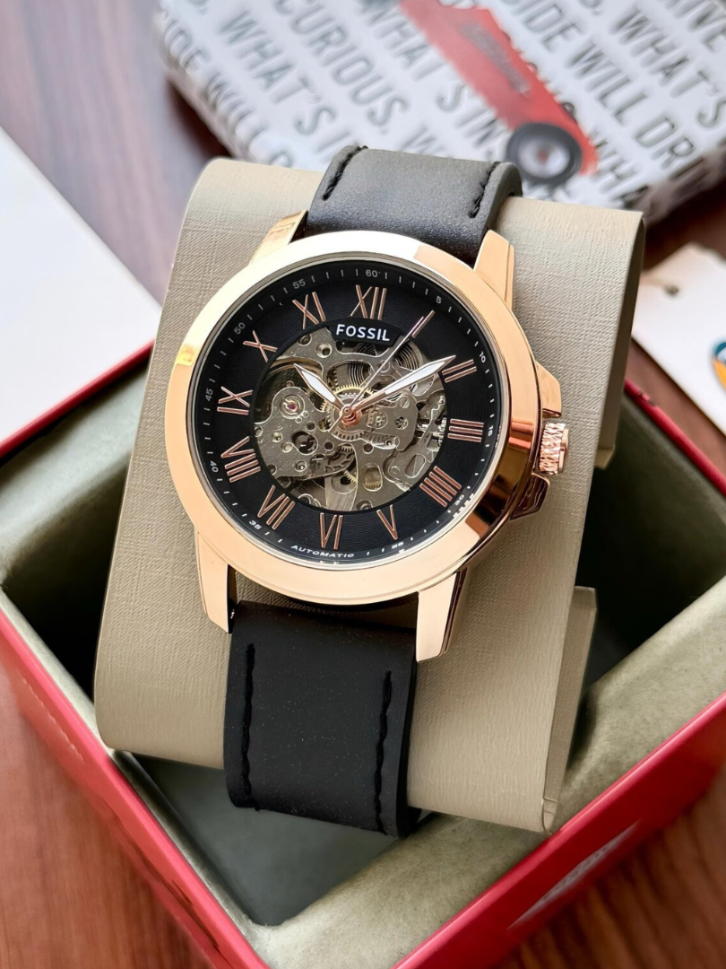 Fossil Townsman Rose Gold Skeleton Automatic Watch – Black Leather Strap, Roman Numeral Men’s Luxury