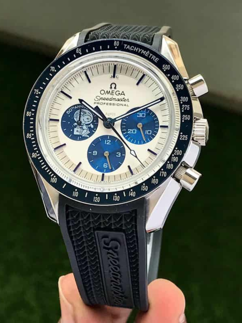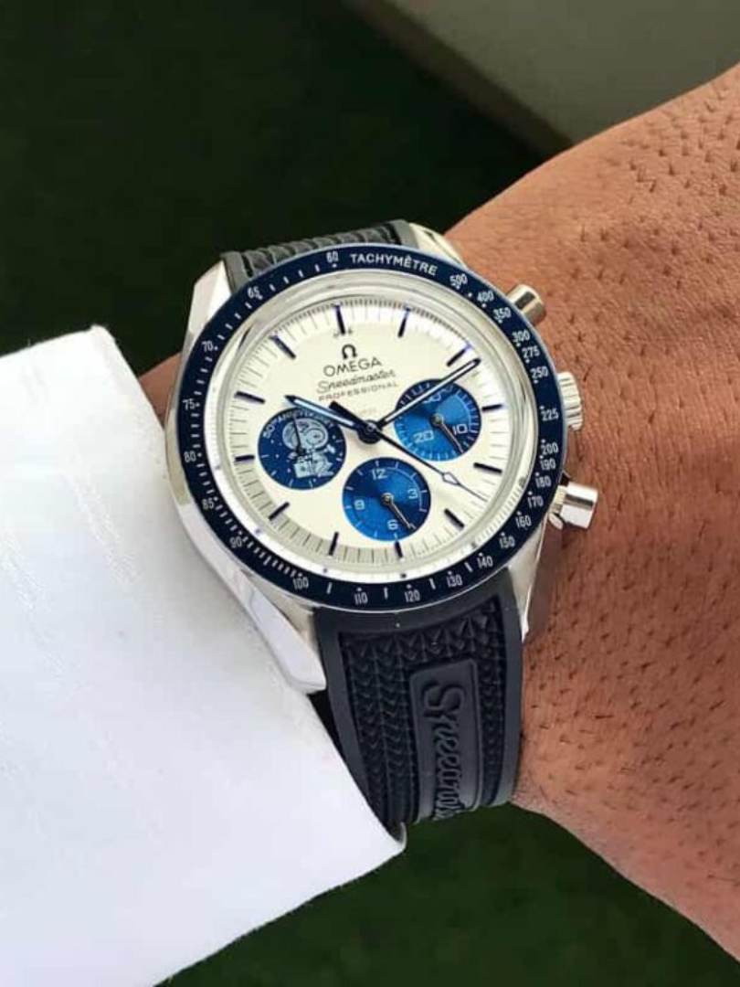 Omega Speedmaster Snoopy Edition Chronograph Watch – White Dial, Blue Subdials, Black Strap, Professional