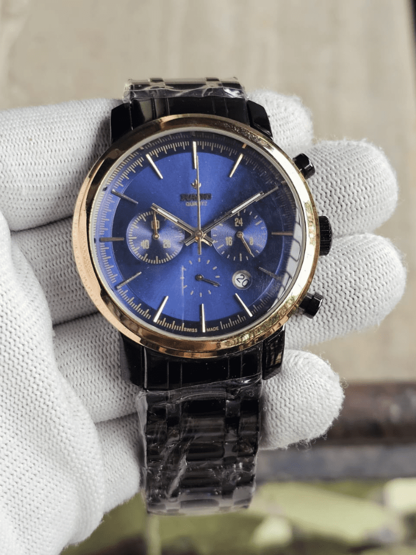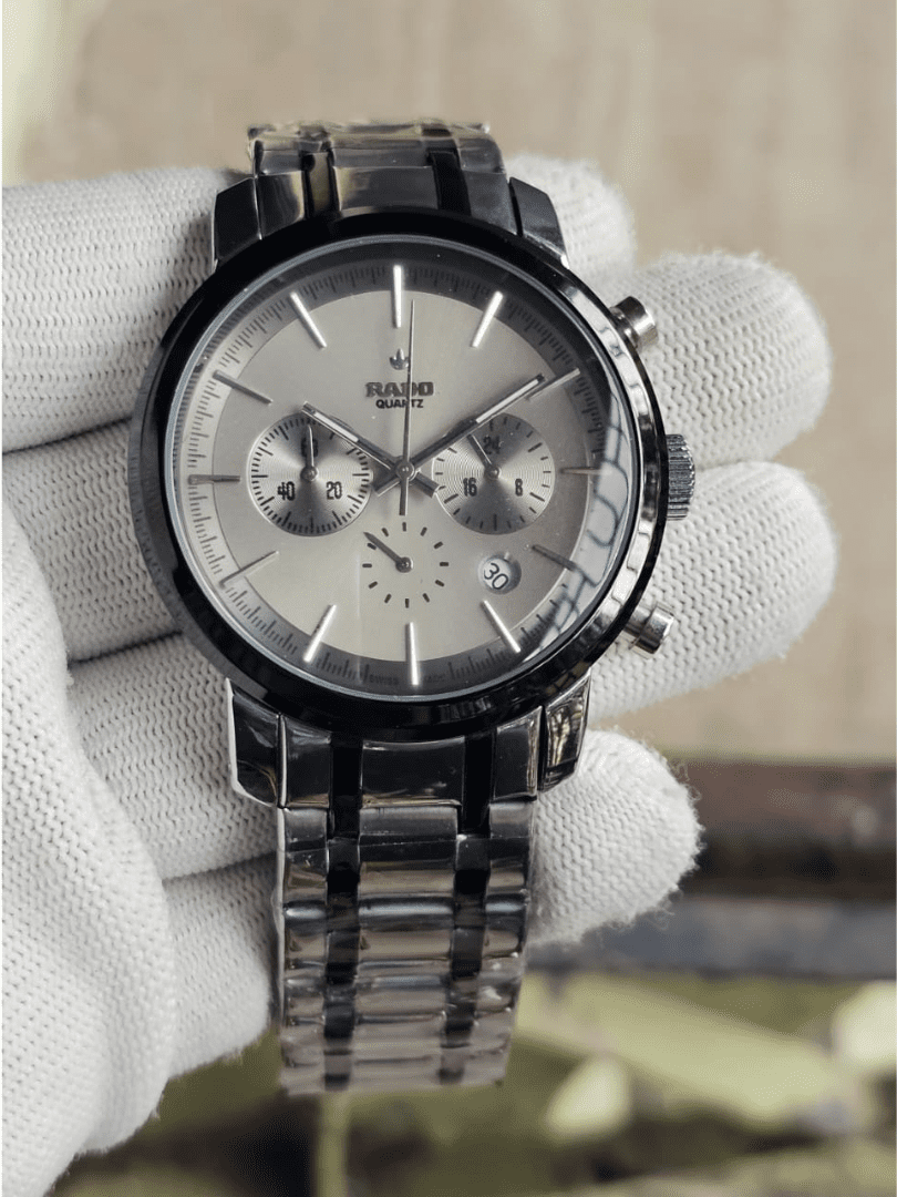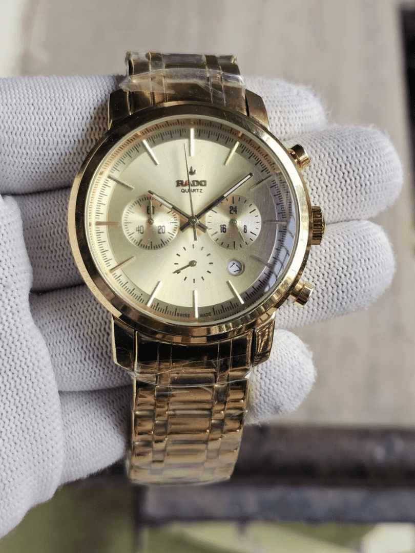Introducing the Rado Quartz gold chronograph men’s watch—a seamless blend of sophistication, function, and Swiss quality.