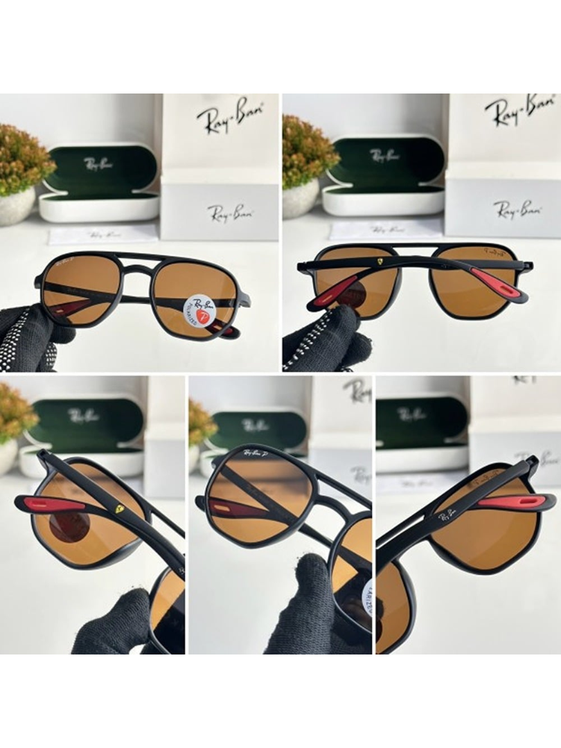 Featuring a matte black lightweight frame, sleek temples with red accents, and brown polarized lenses for clear vision under sunlight, they are designed for both style and function.