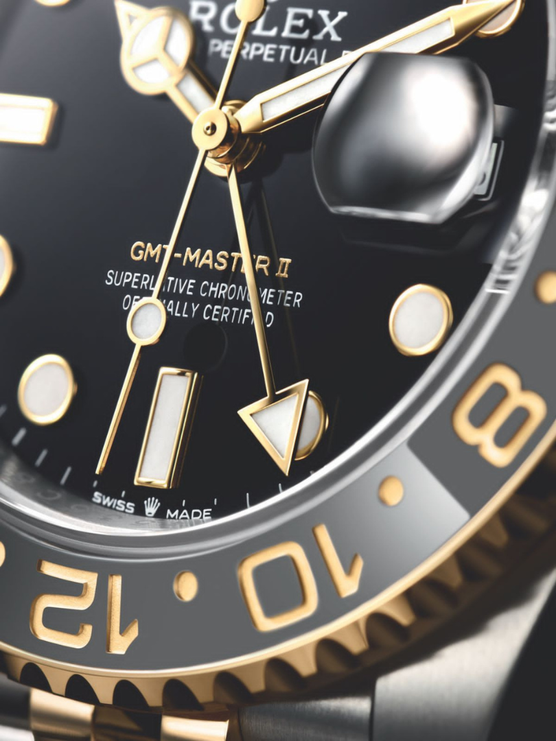 The Rolex GMT Master II gold Batman bezel watch exemplifies traveler’s luxury with its distinctive blue black Cerachrom bezel and independent 24 hour hand for simultaneous time zone tracking.