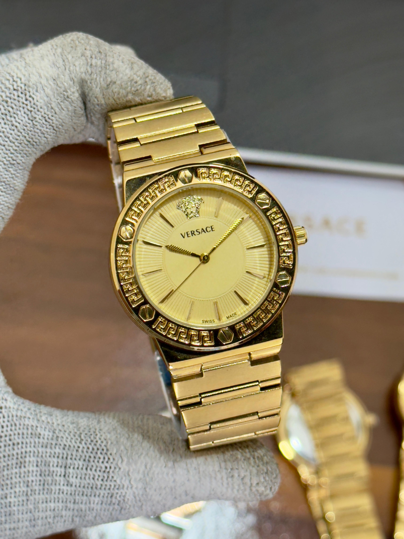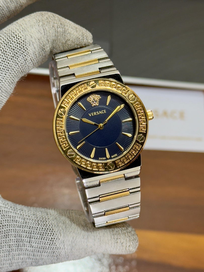 The deep blue dial highlights the gold Versace Medusa head at 12 o’clock, surrounded by radiant hour markers that exude elegance and confidence.